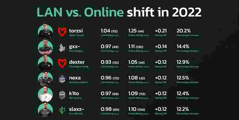 日前HLTV统计了2022年线上赛和线下赛数据相差最大的五名选手。MOUZ战队有两位选手上榜。
