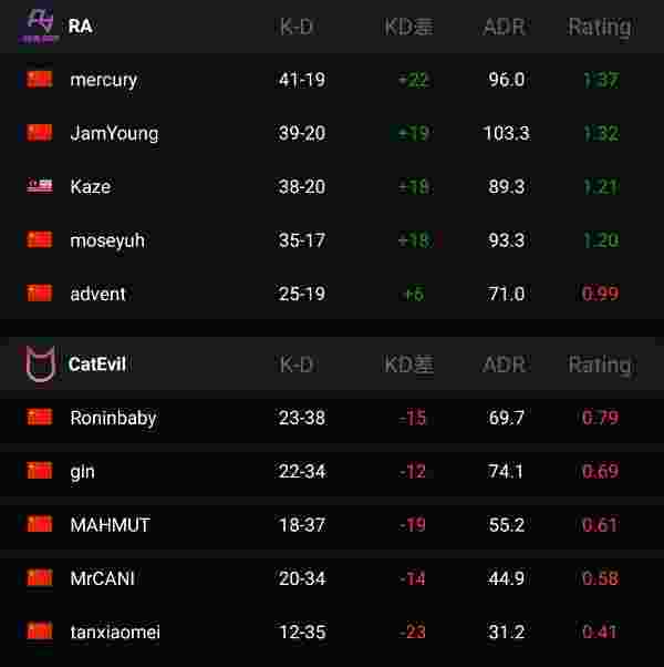 RA在自己的选图Overpass上得心应手,在战术和枪法都略高对手一筹,CatEvil在防守方还能勉强防守,而一到进攻方便一分难求。