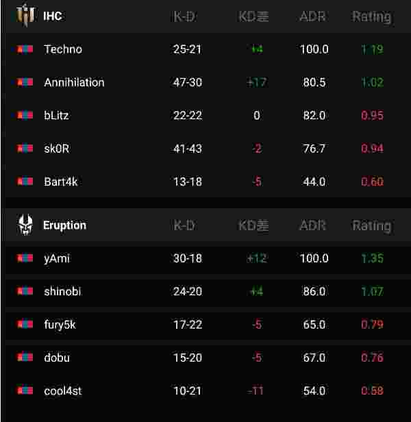 IHC在Inferno上一直保持比分优势,然而在最后几个回合的关键时刻,Eruption总是能找到IHC防守薄弱的地区,在比分落后的情况下绝地翻盘拿下了本场比赛的胜利。