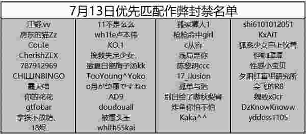 以下为7月13日5E封禁数据统计与7月13日5E优先匹配作弊封禁名单: