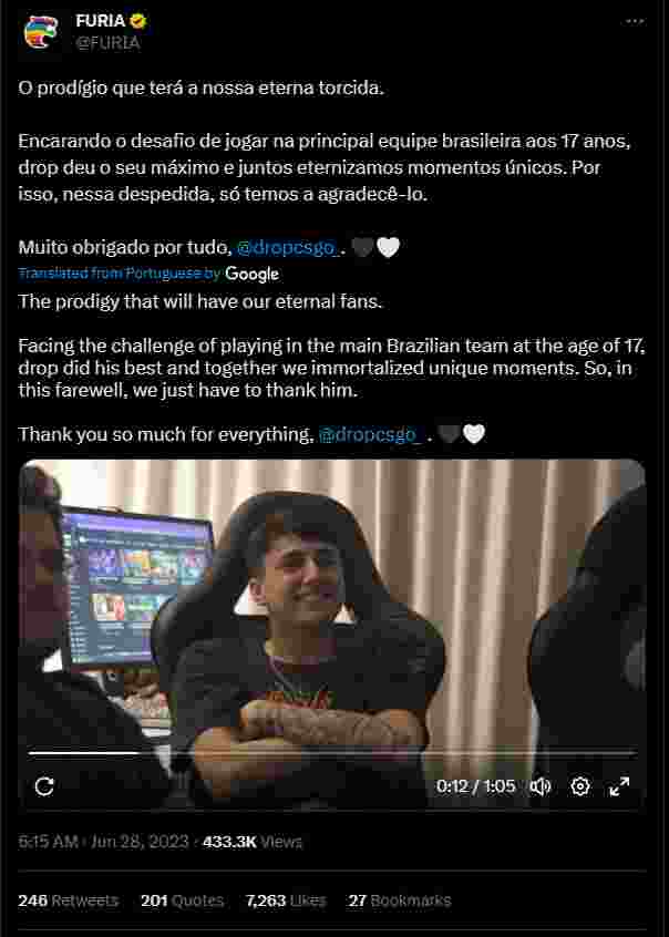 André Abreu|drop已被下放。有消息称,FURIA会把他和狙击手saffee打包送往MIBR。