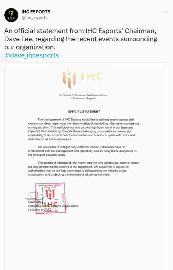 近日外媒报道,IHC战队的冠名赞助商——蒙古公司IH Bit的三名创始因涉嫌通过市场操纵挪用资金和洗钱而被捕。针对这一消息,IHC Esports主席Dave Lee于昨日作出了正式回应。