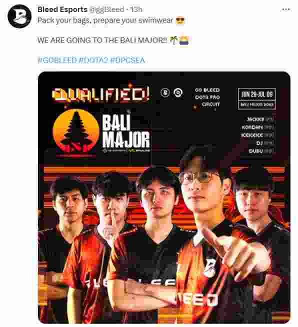 在2-0击败AG(Army Geniuses)后,Bleed战队以五胜一负的战绩提前锁定了巴厘岛Major参赛资格,战队官方在推特发文庆贺了这一令人激动的时刻