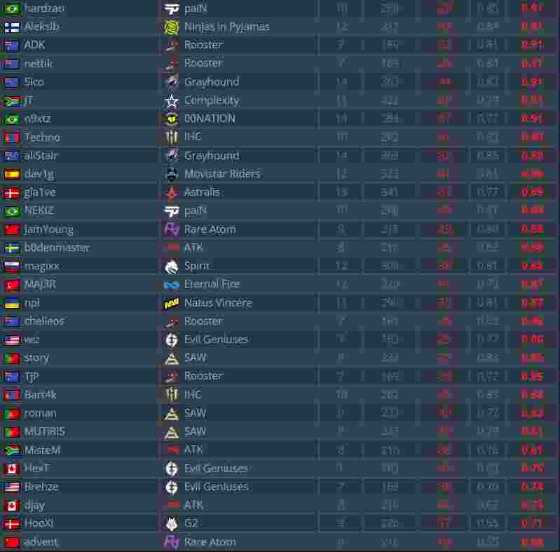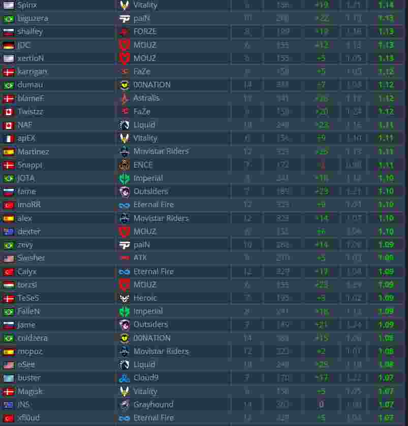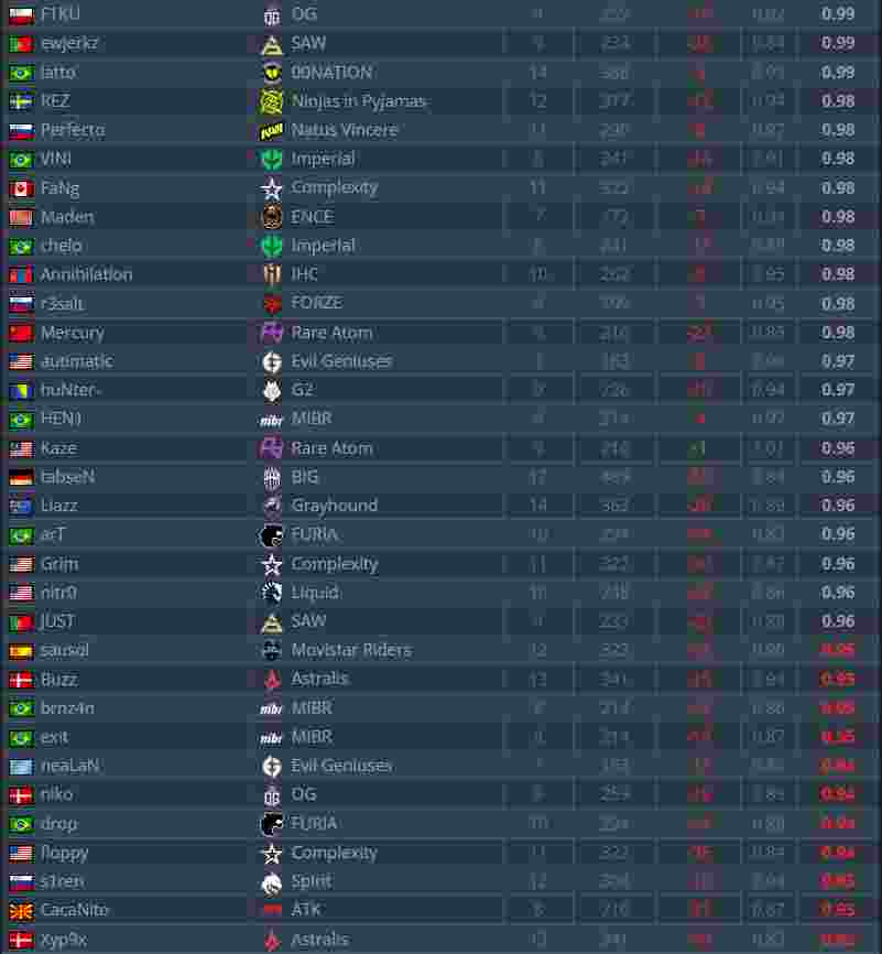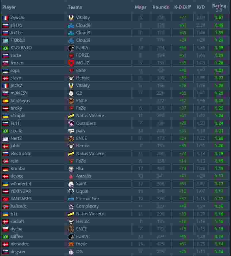 根据ESL统计的EPL S17小组赛中的选手Rating,Vitality狙击手ZywOo登顶榜首,成为本次EPL小组赛最佳选手。NAVI当家明星s1mple位于第14名。(ESL还把HObbit的名字写错了,写成了“Nobbit”,到现在还浑然不知。)