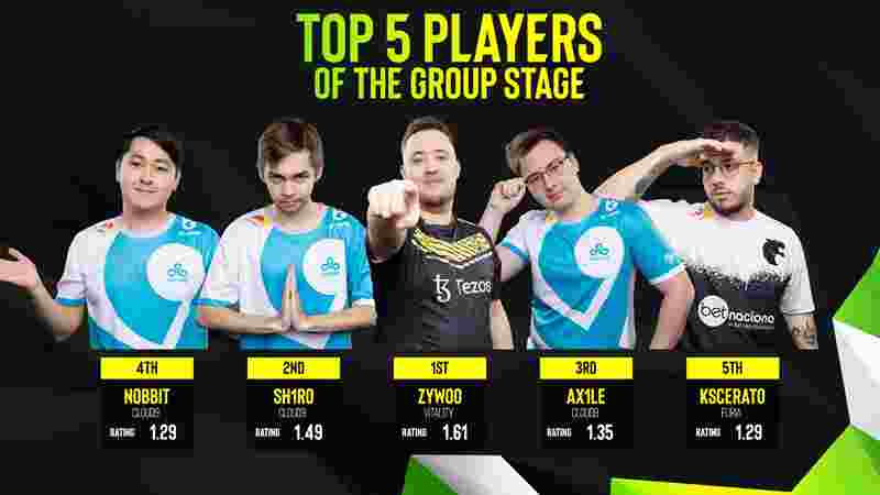 C组小组赛中,小蜜蜂未丢一图以小组头名晋级淘汰赛,ZywOo 在六张地图中以1.61的Rating结束了EPL S17小组赛阶段。而紧随其后的是三名Cloud9选手——sh1ro(1.49rating)、Ax1Le(1.35rating)和HObbit(1.29rating),C9本次小组赛阶段一共打了七张地图。