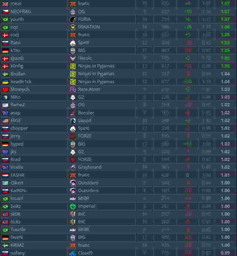 HLTV的完整排名如下(Moseyuh=NiKo;259“力压”HooXi):