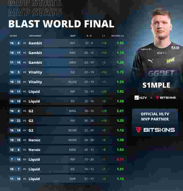本届赛事,s1mple仅在第一轮面对Liquid时出现过“红色战绩”,其余的比赛中他还是一如既往的优秀,在面对G2时他打出了自己本届赛事最高的单图Rating(2.21)。其他的选手在s1mple的数据下显得丝毫没有竞争力,整个赛事他拥有排名第一的平均rating(1.42),排在他后面的分别是Vitality的ZywOo(1.35)和G2的NiKo(1.30)。不仅如此,本届比赛他还有92.7的ADR,0.90的KPR以及79.1%的KAST,Impact Rating也高达1.52。