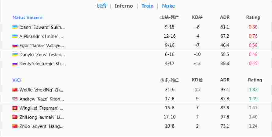 虽然第二张地图Train上被NaVi追回一分,但这都不妨碍zhokiNg挂挡的节奏。来到图三Nuke上仅有S1mple独木难支的NaVi节节败退,最终竟在半场以10-5的巨大优势领先对手。最终状态颓势的NaVi被VG众人血Ru一波以1-2先吃败仗。