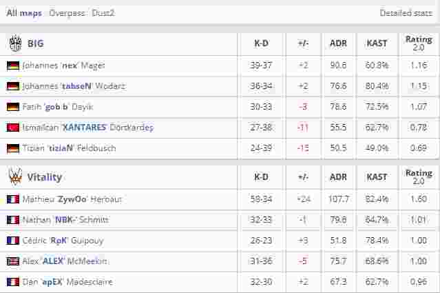 所以畏手畏脚的XANTARES根本没有从前那种一往无前的感觉,突破就是被秒。更何况ZywOo是和你说着玩玩的吗?两张地图打下来107.7的ADR、1.60Rating的恐怖数据你害不害怕?和小编分析的一样,apEX、NBK随便发挥一下就轻松赢下了比赛。