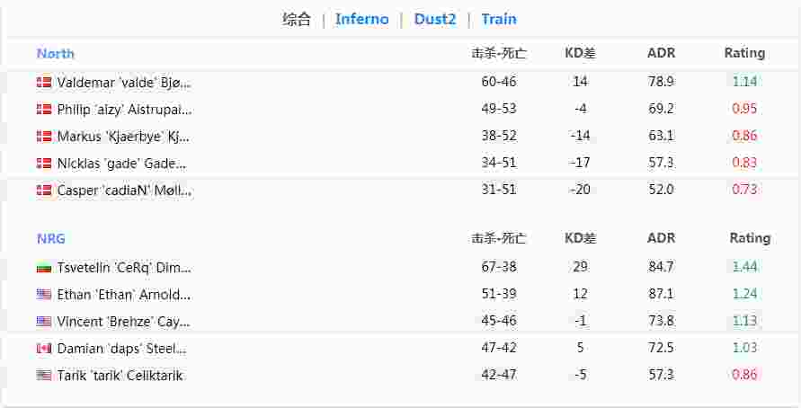 来到下半场后North更是一举翻盘拿到首胜。在之后的比赛中清醒的NRG就没有给对手再次翻盘的机会,在对手选择的Dust2上gade、valde两人以良好的发挥扳回一城,最终竟在Train上剃了North一个光头16-0拿下首轮比赛。