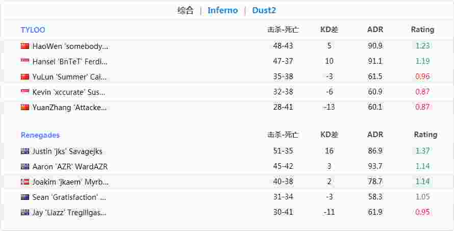 今天TYLOO的状态也异常的离线,队内协同失误极多导致在首图Inferno上一度被对手13-2领先。虽然下半场成功追回不少分数,但之前的坑太大容错率极低最终还是被对手击败。在图二Dust2依旧没有起色的TYLOO最终以2-0输给Renegades。