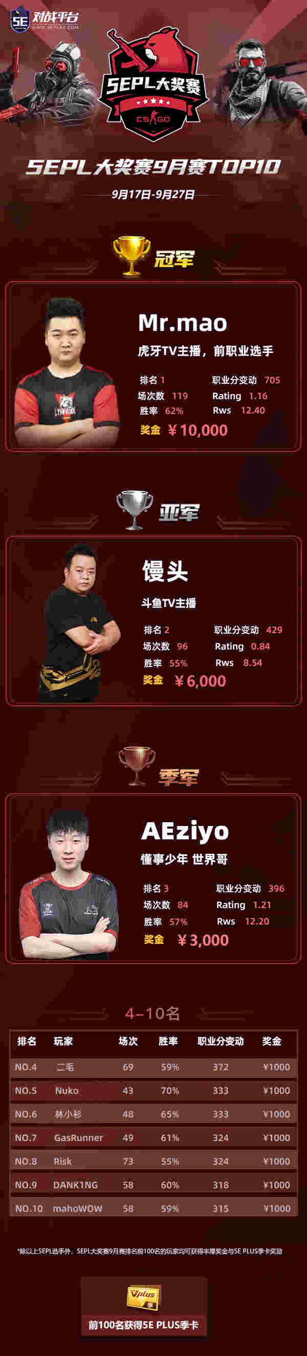 5EPL大奖赛9月赛正式收官,Mr.mao依旧无人能挡凭借高胜率高数据的亮眼表现实现5EPL大奖赛三连冠,紧随其后的是斗鱼TV主播馒头以及钢盔的世界哥AE。