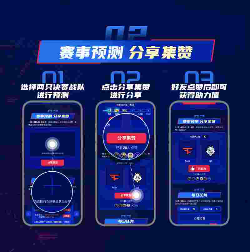 赛场局势紧张刺激,场下观赛气氛也不能落上,12月14日—16日期间,大家可在活动页面中选择你认为能晋级决赛的两支战队。完成选择后,大家便可分享自己的预测结果,并号召好友点赞助力,点赞数将1:1转换为大家的助力值。