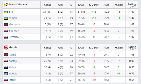 决赛图来到Inferno,Gambit在战术的灵活调整上不甘示弱,防守一改风格,打法激进战术灵活,双方你一分我一分,比赛异常刺激,以Gambit 7-8 NaVi结束上半场。下半场比分继续僵持,差距始终没有拉开,直到NaVi以15-12拿到赛点,最后一回合Gambit在A骚扰后选择进攻B区,B点perfecto、Boombl4二人拖足时间创造足够回防空间,拿下整场比赛夺冠。