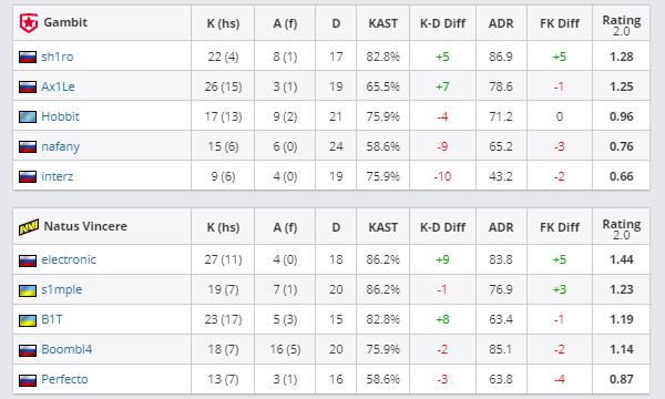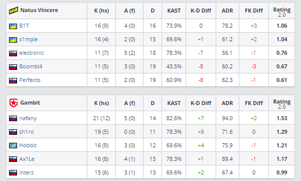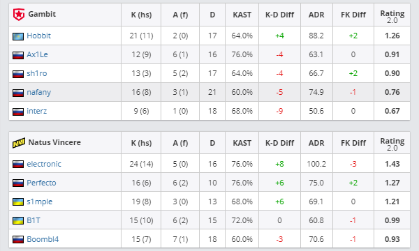图二来到NaVi选择的Dust2。开局Gambit顺利拿下手枪局,上半场Hobbit多次扮演关键先生强行劣势翻盘拿分,但sh1ro手感渐冷,大狙频频空枪,凭借electronic、Perfecto、s1mple三人的良好发挥,NaVi逐渐在对抗中抢占上风,以10-5结束半场。到了下半场防守时,electronic化身炮台电子爹,多次表演站桩输出多杀,最终以16-9拿下图二。
