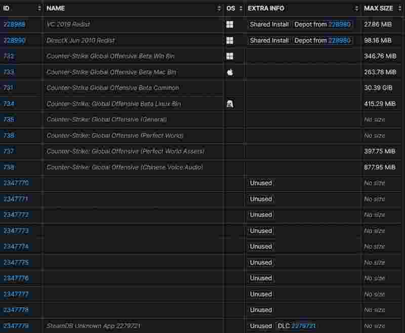 在SteamDB上可以看到该DLC的新附加组件与应用程序有关。该应用于1月11日被下载(ID 2279721 / ID 2279720)。并且内部人士透露,该附加组件可能与发布新版本和视觉内容有关(皮肤或贴纸)。然而,现在SteamDB上有了新的分支,它显示该DLC适用于不同的操作系统,这意味着该DLC对csgo进行了大量更改。