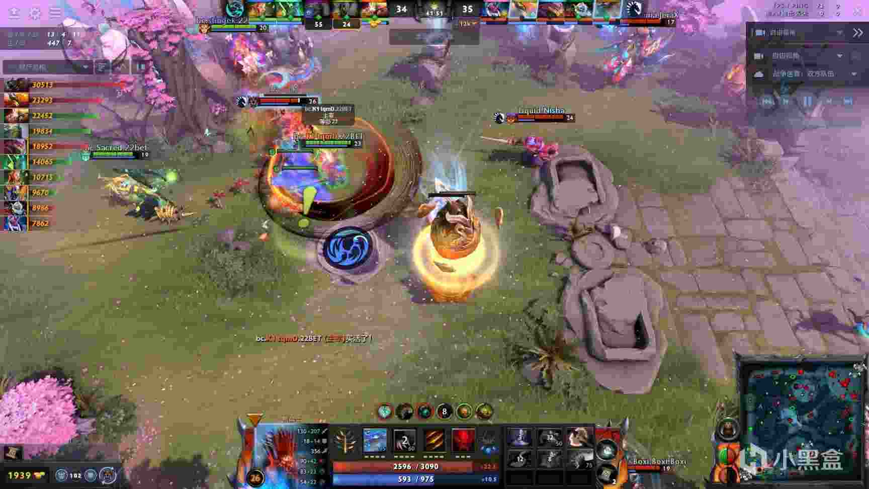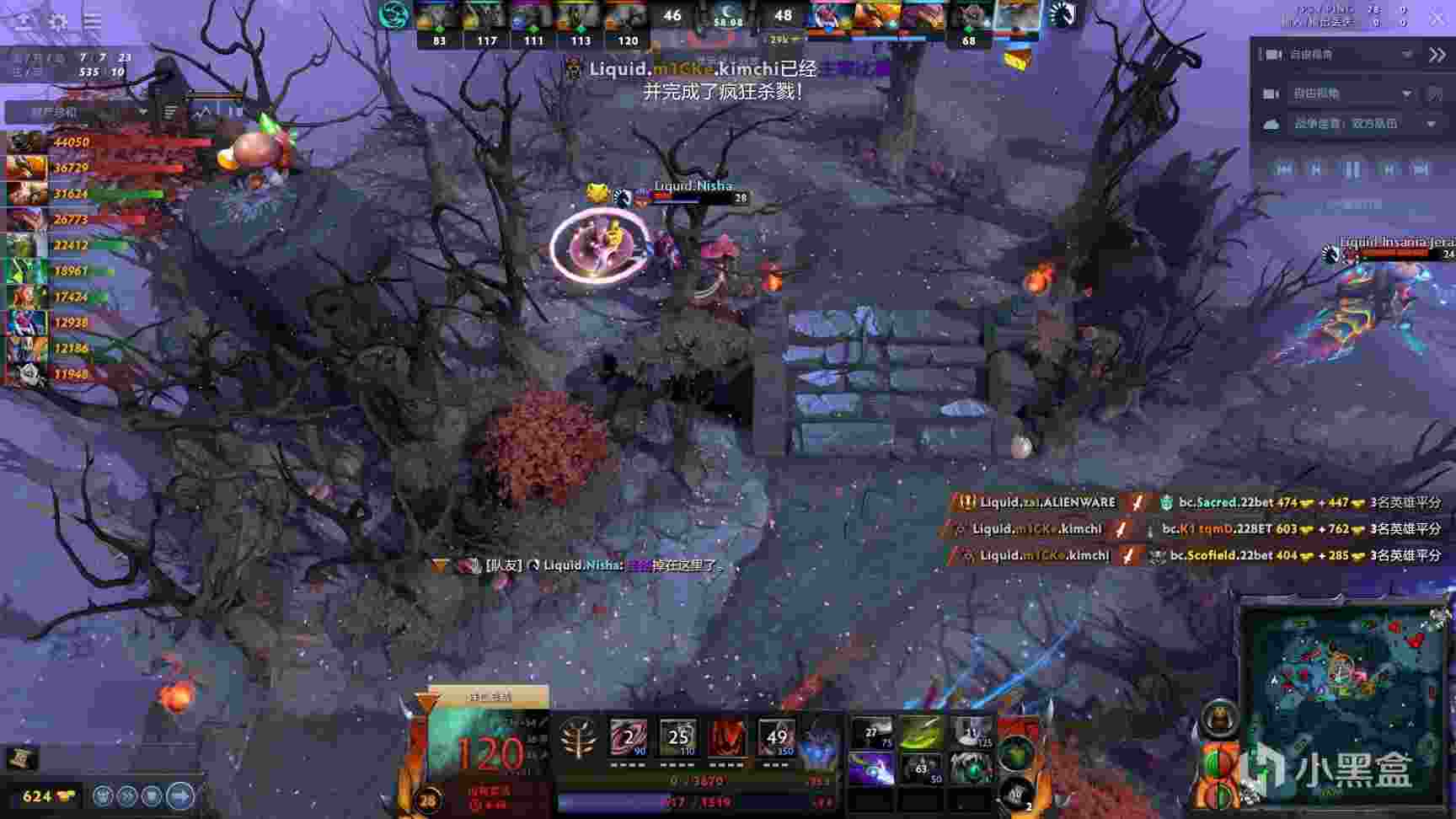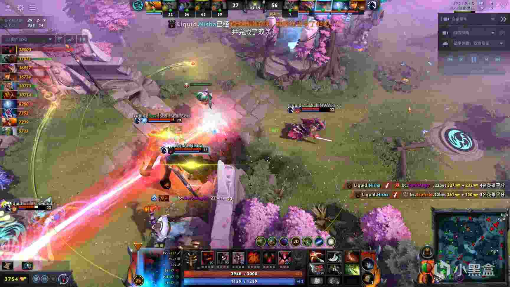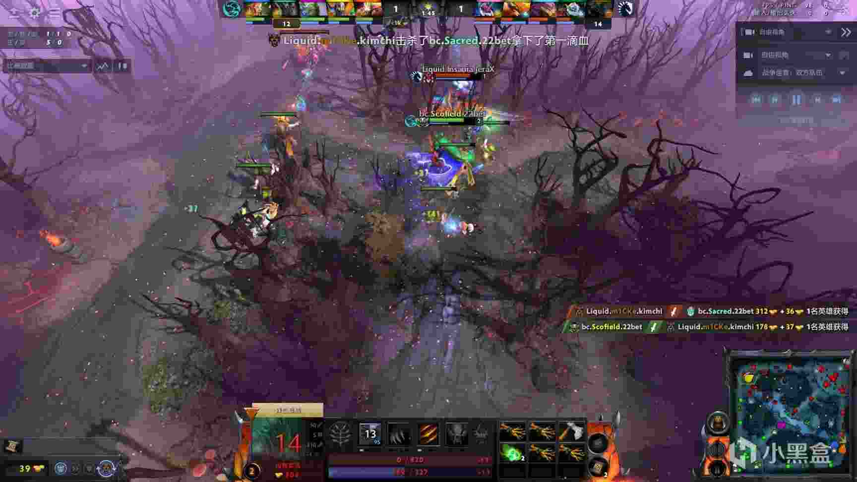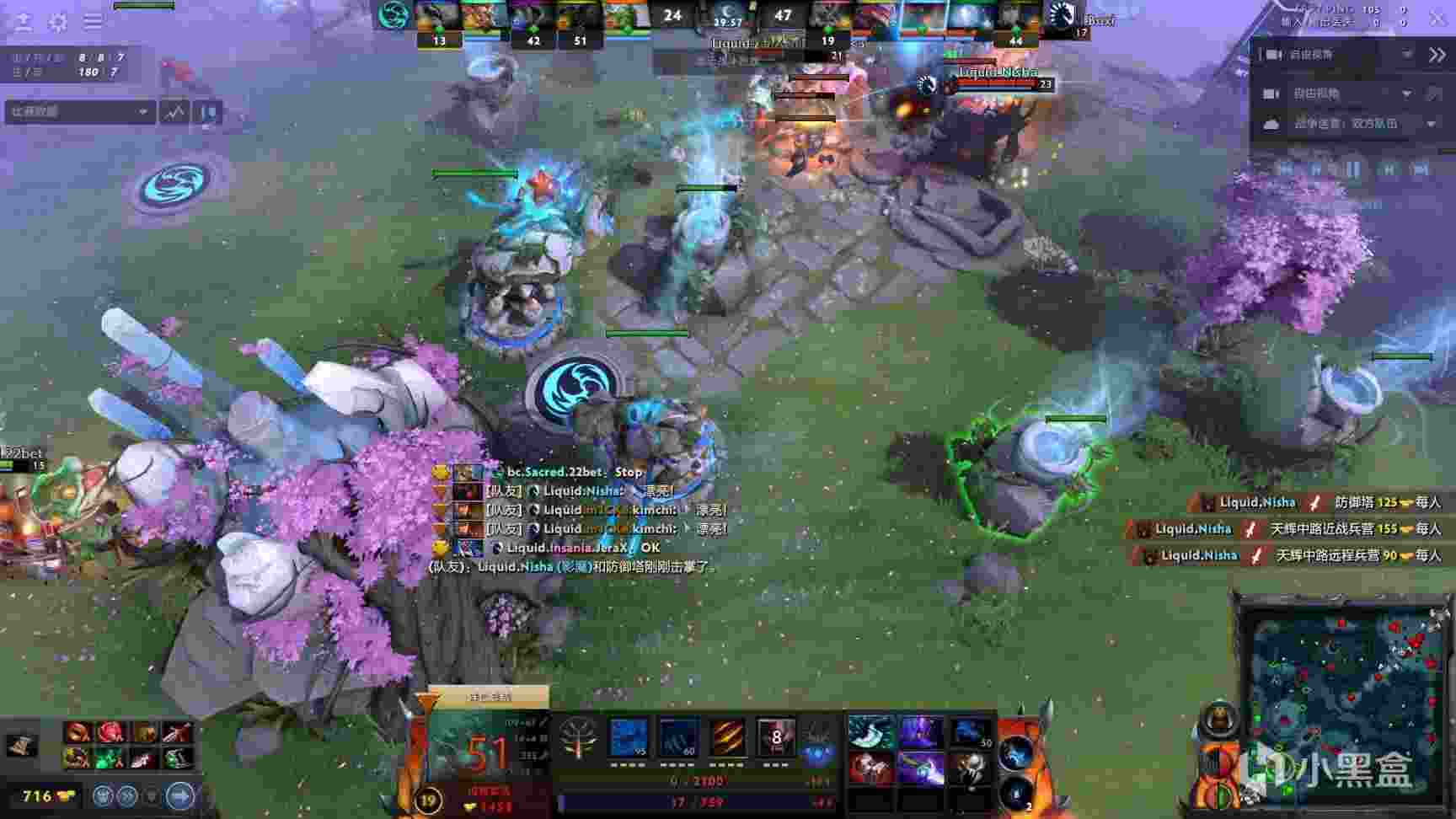 39分钟,Liquid进攻bc中路,nec被否决后被秒,随后bkb小小进场,但是被打出盘子后还是吃了否决撕掉,Liquid顺势拆掉bc下路和中路高地,经济领先6k。