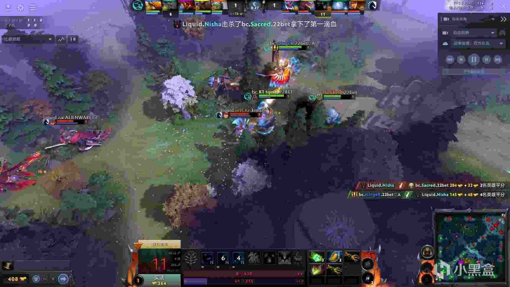 22分钟,Liquid开雾在上路撞见刚使用分身斧的剑圣,剑圣被杀掉,Liquid乘胜追击,再追死nec。