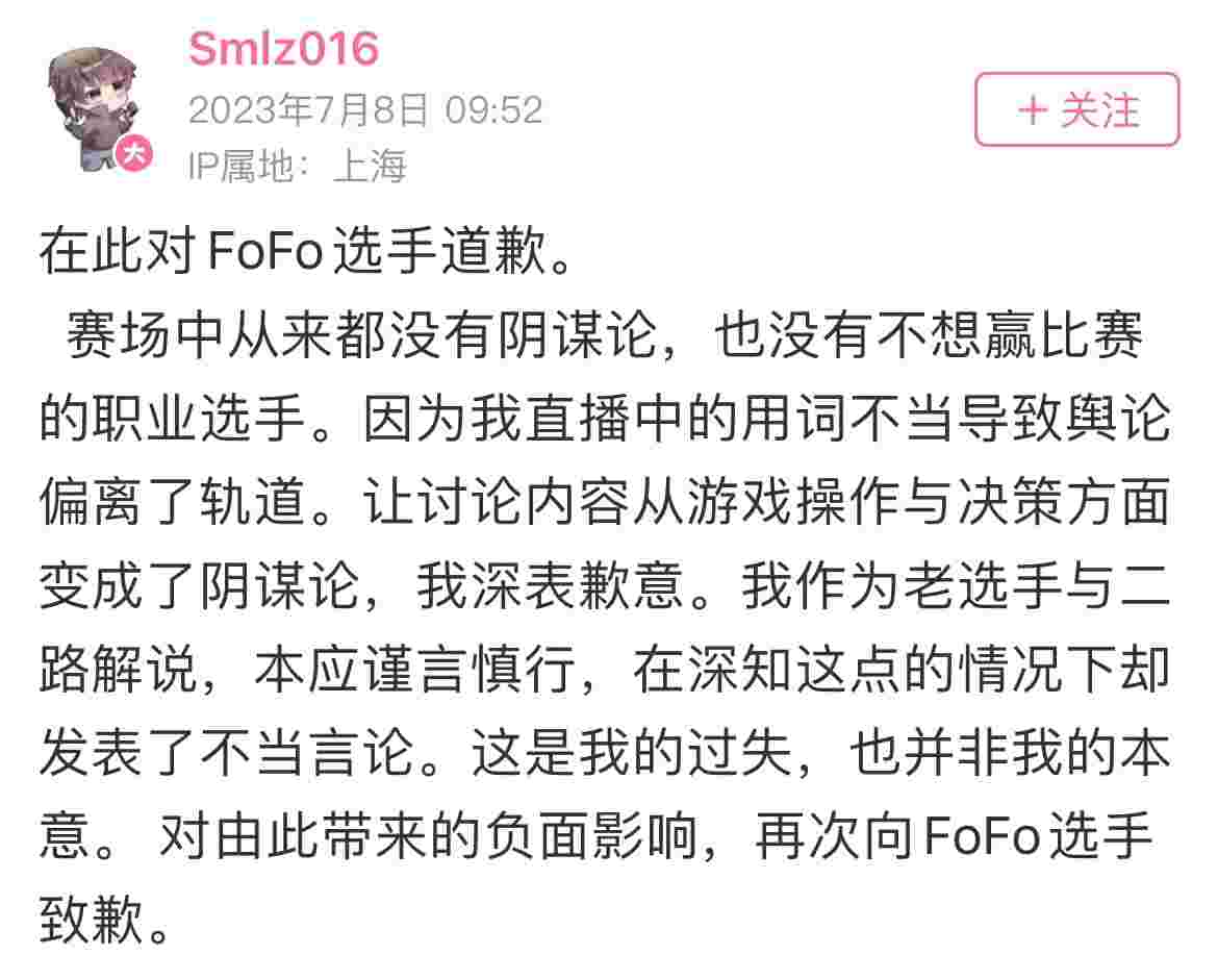 赛场中从来都没有阴谋论,也没有不想赢比赛的职业选手。因为我直播中的用词不当导致舆论偏离了轨道。让讨论内容从游戏操作与决策方面变成了阴谋论,我深表歉意。我作为老选手与二路解说,本应谨言慎行,在深知这点的情况下却发表了不当言论。这是我的过失,也并非我的本意。 对由此带来的负面影响,再次向FoFo选手致歉。