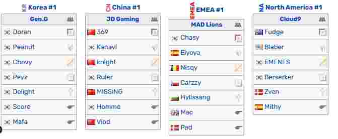 这是四大联赛的春季赛冠军,LCK的GEN.G是全韩国人阵容‘LPL赛区的JDG拥有Kanavi和Ruler顶级韩援;刚刚拿到冠军的MAD上单Chasy来自韩国,并且Chasy也拿到了春季赛FMVP,实力不容小觑;来自北美的LCS C9战队,中下组合EMENES和Berserker也都是韩援,Berserker曾是T1青训选手,并且在本赛季Berserker获得了LCS春季赛常规赛MVP。