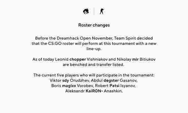 “在11月的Dreamhack公开赛之前,Team Spirit决定,以新阵参加比赛。从今天起, chopper和mir被下放,并列入转会名单。”