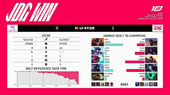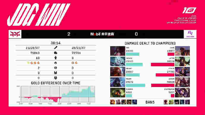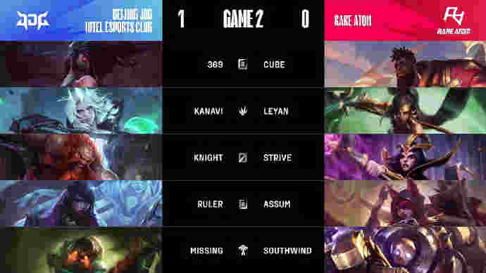 奎桑提单带下路时打出永恩的盾弓被动,兰博赶来开大尝试留人,奎桑提开疾跑扬长而去。JDG正面趁机破掉RA中、下两路水晶,拥有了两路超级兵线的优势。RA抱团在中路集火带走了锤石,可是已经交了多个大招,无力再接后续团战,加上超级兵的压力很大,无奈目送JDG无压力收下大龙。23分钟JDG携带大龙buff兵线平推上路高地,RA的集火目标转为金克丝,不过JDG的保护相当到位,金克丝稳健拉扯全身而退,杰斯poke伤害拉满斩获三杀,JDG打出0换3一波结束比赛,1-0先下一城!