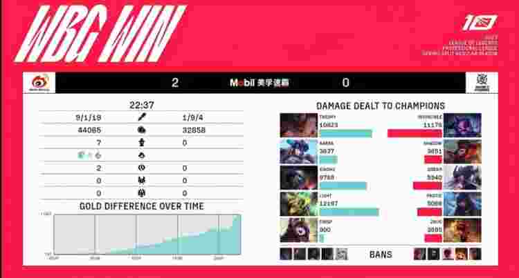20分钟刚到,WBG进攻中路二塔,NIP以攻为守想要上前开团,但猴子刚刚进场就被秒杀,随后NIP阵型土崩瓦解四散奔逃,WBG三面包夹完美配合0换5轻松团灭了NIP,墨菲特直接空大进塔庆祝,随后WBG众人也不再拖延节奏,直接中路推进强拆一波拆掉基地,光速结束了第二局比赛,恭喜WBG 2-0轻松取胜!