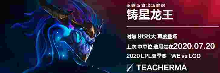 时隔968天龙王再度登场,上次在中单位的选用还是2020年7月20日WE VS LGD的对局中,由TeacherMa选手使用。