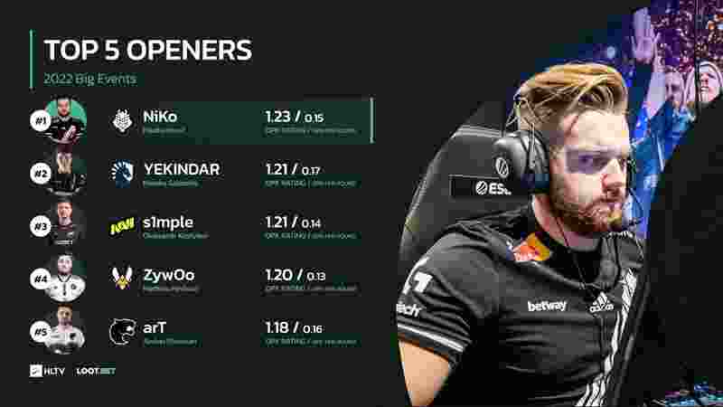 HLTV统计了2022线下大赛中排名前五的突破手,NiKo凭借1.23的首杀Rating和每回合平均0.15个的首杀数登顶榜单。(注:样本必须高于50张大图)