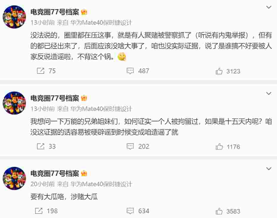 但是,紧接着另一个LPL圈内爆料人:电竞圈77号档案,跳出来说这个瓜可能是LPL有选手涉嫌聚众赌博,并且可能有选手进局子里蹲过,这件事的真实性有待商榷,但是如果是实锤,这件事的影响可能是灾难级别的!