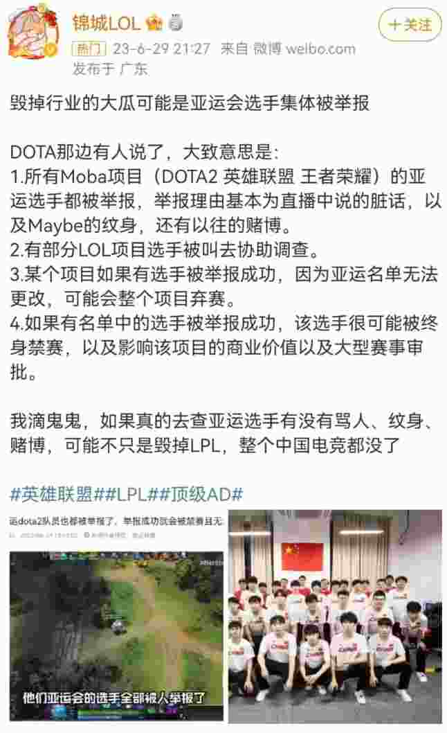 另外,还有消息源,比如下图爆料人:锦城LOL,提到LOL项目有选手去协助调查,可能就是赌博事件,如果被证实是真的,因为亚运名单无法更改,那么官方可能就会直接取消这个项目的资格,那这么说确实是整个项目都被毁掉了!