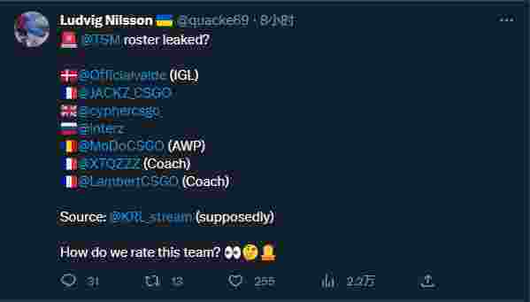 KRL泄露的这套阵容和之前爆料的消息有一定的相似度,比如JACKZ、CYPHER和interz三人先前就传言在和TSM俱乐部进行接触。而这里主要的变化在于指挥和狙击手。valde先前效力于ENCE战队,2022年8月valde正式加入