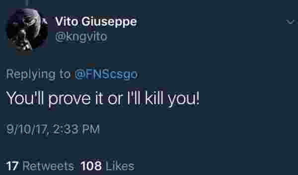 接下来发生的事情更为恶劣,彼时CLG的指挥FNS在推特上自嘲式的开了个玩笑,笑自己的队伍连宿醉状态下的Immortals都打不过,而kNgV-在回复中却极为光火,甚至拿对方的生命进行威胁:“你最好有证据,否则我会杀了你。”不仅如此,kNgV-甚至在酒店里到处寻找FNS的下落,企图要把事情在线下做个了断。