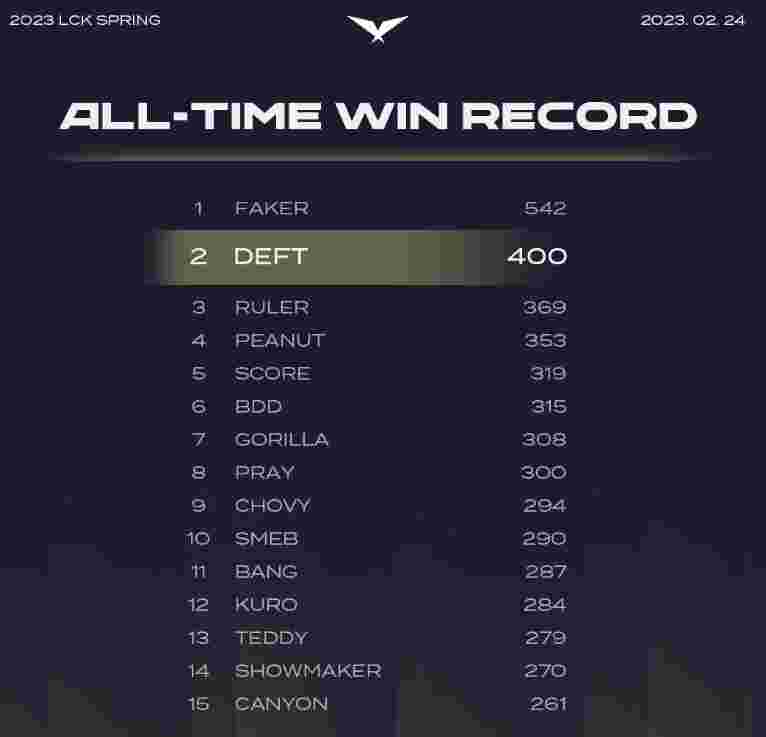 DK官方发表公告:“十年的劳动成果,DK.Deft选手成为第二名达成LCK400胜选手,祝贺Deft!”