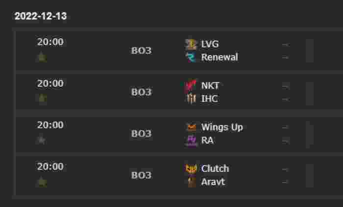 淘汰赛阶段的比赛时间为2022年12月13日20:00。四场比赛同时进行,四场比赛分别是LVG vs Renewal、NKT vs IHC、Wings Up vs RA、Clutch vs Aravt。淘汰赛阶段来自我国的队伍有LVG、Wings Up以及RA,其中Wings和RA这两个队伍在淘汰赛第一轮就碰上,强强对决会碰撞出什么火花呢?小编非常期待他们本场比赛给我们带来的视觉盛宴。