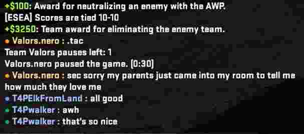 nero的“素质”行为发生在2月2日,当时他所在的Valors战队与ONET4P在ECL S40的小组赛中相遇。在输掉一小局后,nero请求暂停,然后公屏打字:“不好意思,刚刚我的父母进我的房间,告诉我他们非常爱我。”