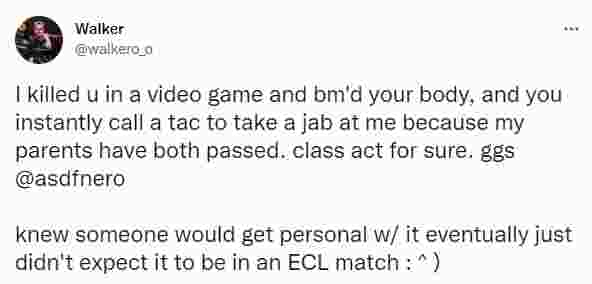 这条看似无害的信息实则拥有完全相反的背景,ONET4P的加拿大选手walker最近刚刚不幸失去了双亲,nero可能是知晓的。但即便进行了嘲弄,Valors还是战败,而walker也发布推特,将ESL的注意力引向nero的行为。