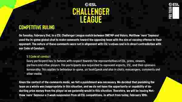 ESL认定nero的行为违反了规则,决定单独予以处罚。在相关帖子下方,许多人认为三周的禁赛太轻,应延长至三个月。