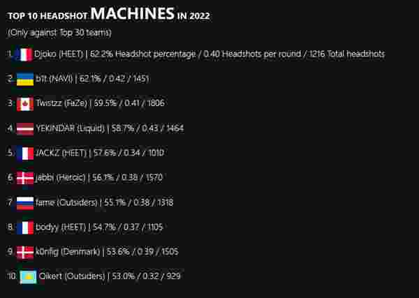 我们能看到榜单上来自HEET的Djoko以62.2%位于榜首,而第二名的b1t仅比Djoko低了0.1%。除此之外,大家所熟知的顶级步枪手Twistzz、YEKINDAR、jabbi等选手同样榜上有名。