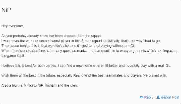 因此出现问题时大家都会争论不休,从而导致成绩一塌糊涂。对于变阵这个结果,相信对双方都是最好的。希望可以找到一个新的队伍,在真正的指挥下打比赛。同样也祝愿NIP的前队友们,尤其是Rez,他是我见过最好的队友之一。感谢NIP、Hicham和全体工作人员。