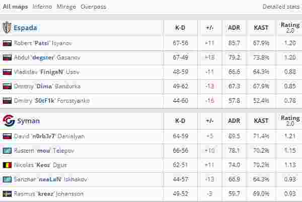 Syman vs Espada 2-1(Inferno 12-16;Mirage 19-15;Overpass 16-6)