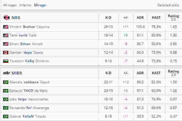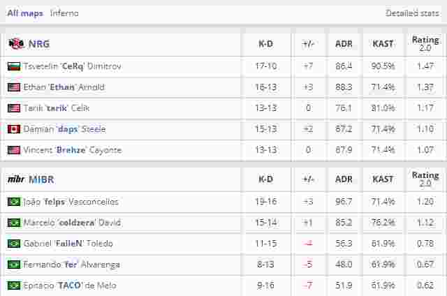 在首张地图Inferno上NRG的进攻非常凶猛,屡次针对香蕉道的控制让B区的防守队员十分难受。开始MIBR还能凭借个人能力与对手势均力敌,但每当比分将要追平反超时却总是再次被NRG扩大。虽然巴西人很多次都赌对了对手的进攻方向,可是枪法和枪械的劣势总是让他们难以翻身。