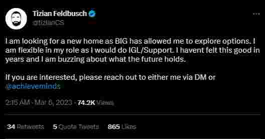 现年26岁的tiziaN自2022年10月份便被下放至BIG青训队,与小将k1to互换了身位。他上一次比赛是在今年2月10日,队伍1:2输给了Endpoint,之后便成为替补。看来经过一个月的放空,如今的tiziaN已经准备好开启职业生涯的下一站了。