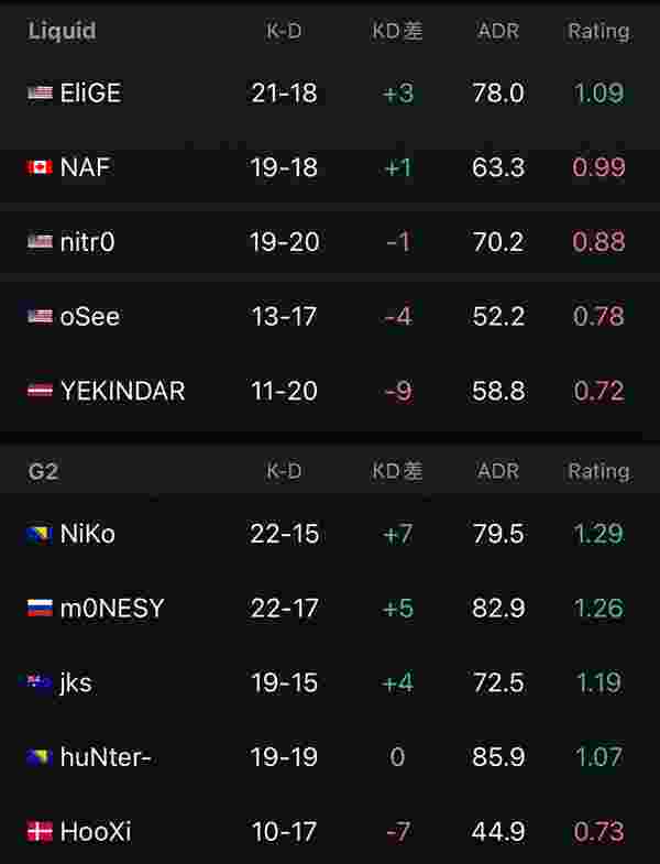 第二十二回合,Liquid在前期取得人数优势后选择集合进攻B区,但NiKo站在沙袋上化身战神,凭借一把A4拿下两个爆头击杀,后位的太子也完成了击杀,直接瓦解了Liquid对B区的进攻,逼迫Liquid进行保枪,G2成功拿下赛点。最后G2也没有再给Liquid机会,以16:7取得了图一的胜利。