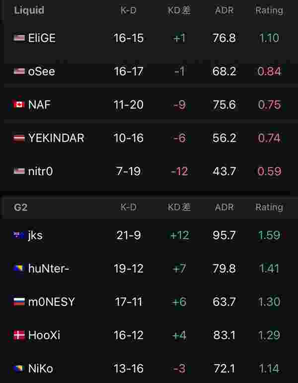 第二十三回合,太子拿下首杀后准备进攻B区,被下水道前压发现后呼吸选择灵性转点,G2兵不血刃攻入A包点,但最后NAF在二楼击杀三人成功让他们没有获得补偿,G2经济受到极大冲击。但G2此时已经高歌猛进,NiKo也开始了疯狂的发挥,不停的击杀粉碎了Liquid在各方位的防守阵型,G2全员全员在线。第二十五回合,oSee在B区拿下三杀,成功将时间拖至队友回防,Liquid面对2V1残局也没有给G2机会,没有将赛点让出。随后G2重新组织进攻,而Liquid队员在重压之下也开始出现失误,G2没有再复刻之前的长痛,成功以16:12获取胜利!