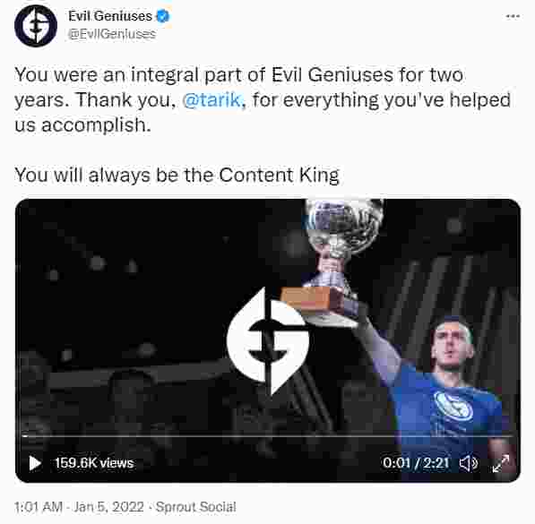 EG宣布,tarik在经过两年多的合作时光后,现已离开队伍。这位25岁的选手在2019年随NRG被打包签下,直至2021年4月离开主力阵容前,他共为俱乐部获得了5座冠军奖杯。