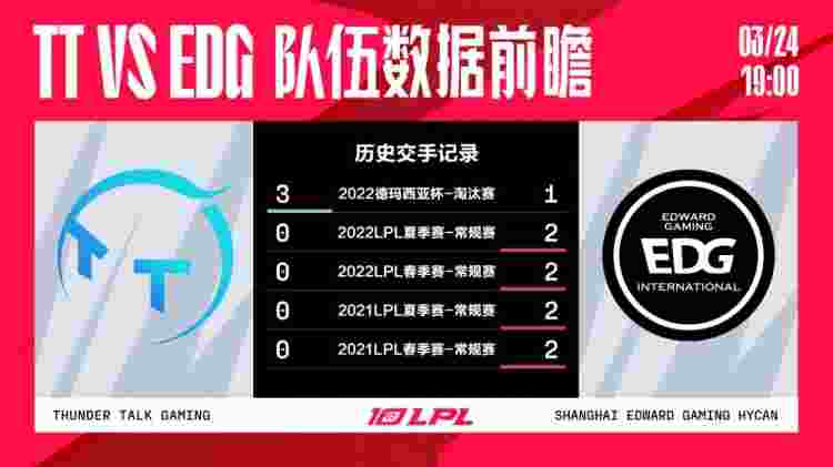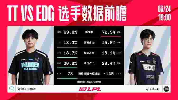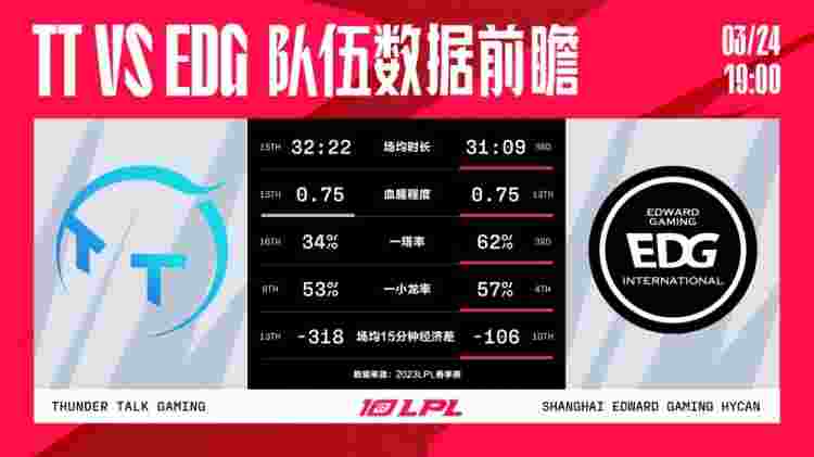 北京时间3月24日,2023LPL春季赛即将上演TT与EDG的比赛,两队都已经进入季后赛,但EDG对复活甲势在必得,让我们一起砍下LPL官方给的赛前数据。