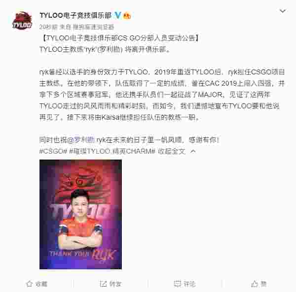 TYLOO主教练“ryk”(罗利勘) 将离开俱乐部。