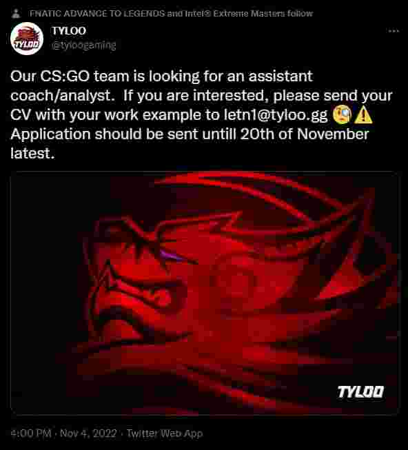 “我们的CS:GO团队正在寻找一名助理教练/分析师。如果你有兴趣,请将你的简历和你的工作案例发送至letn1@tyloo.gg。申请最晚在11月20日之前发送。”