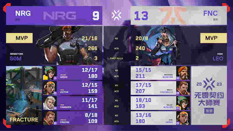 本局比赛FNC 13:9 NRG,MVP给到了Leo选手。